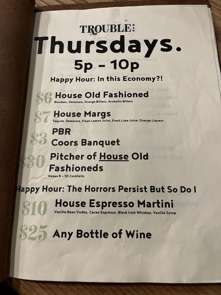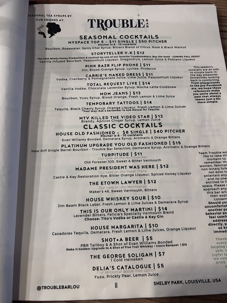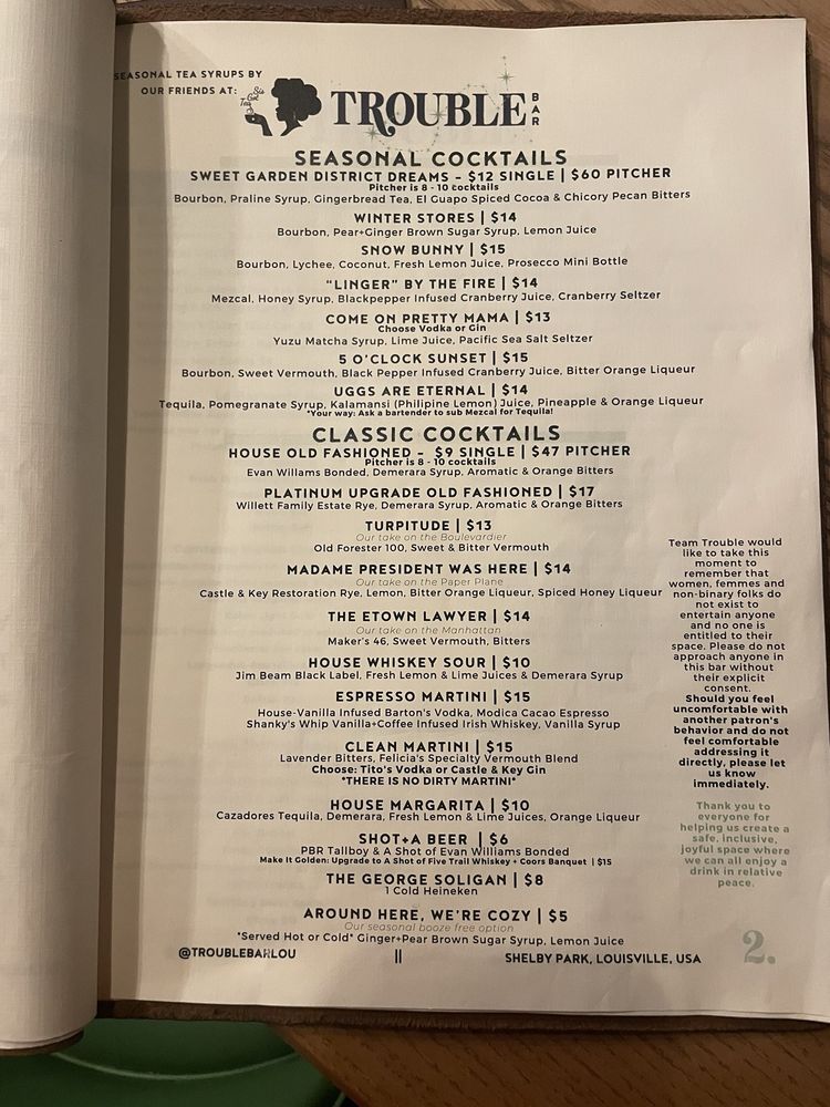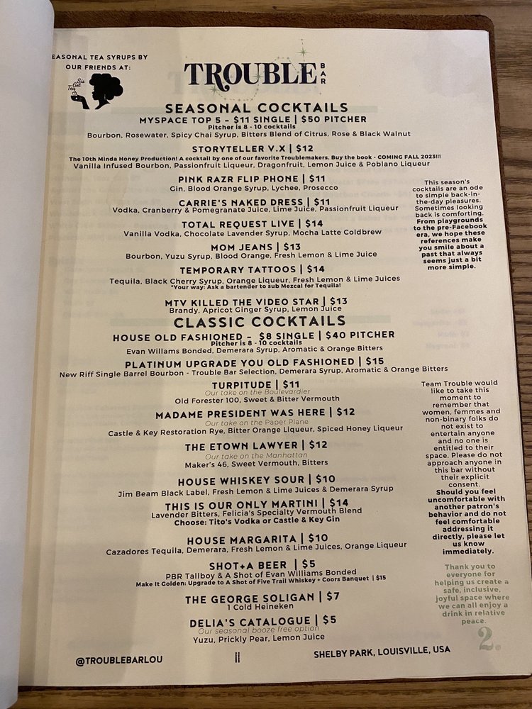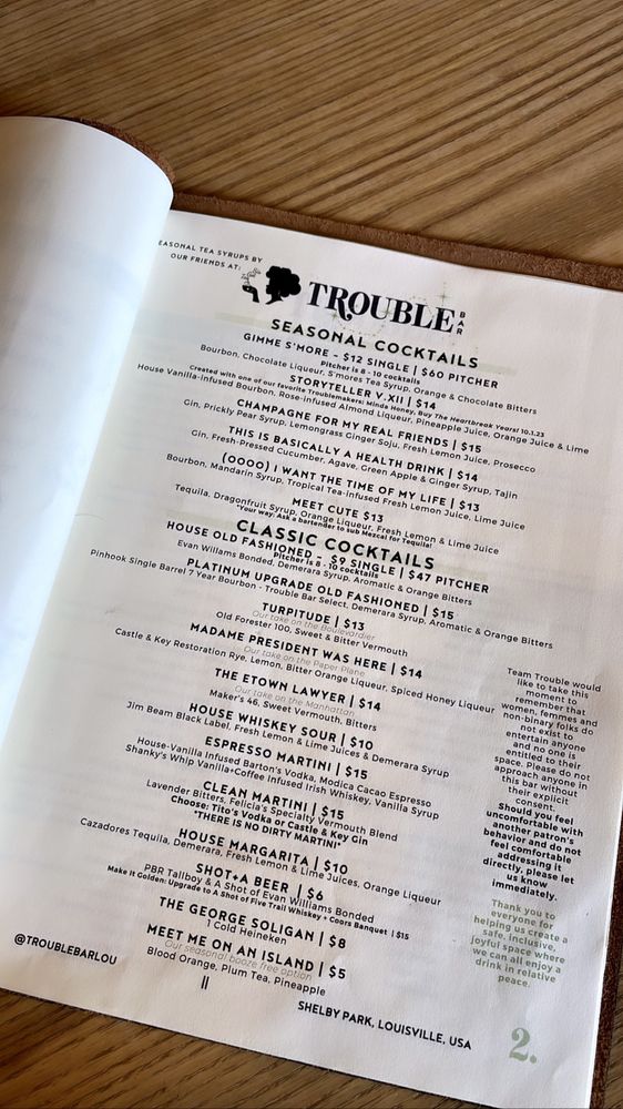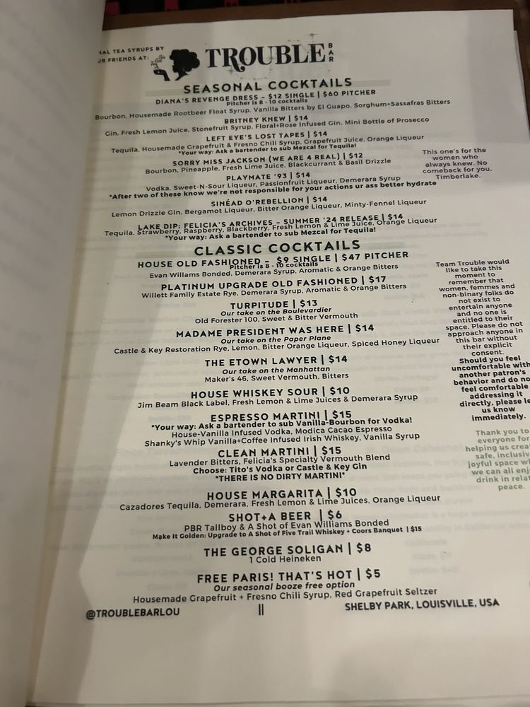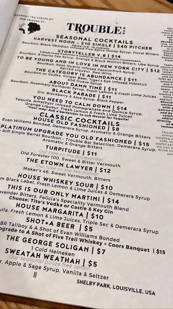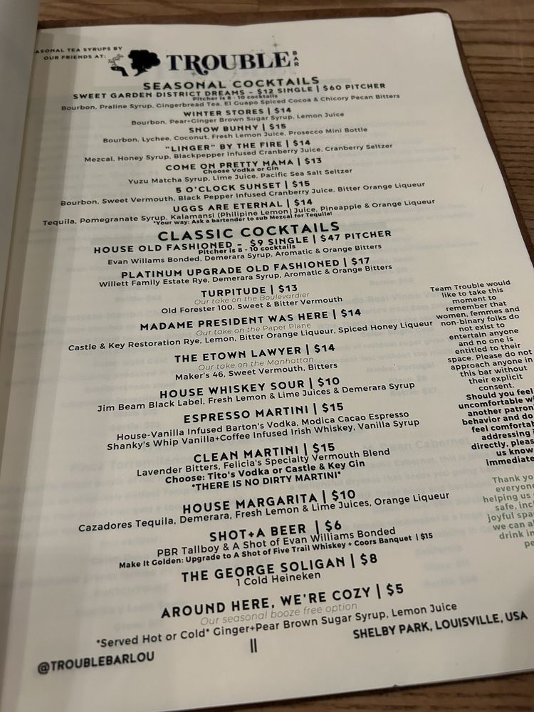Trouble Bar, a whiskey and cocktail bar located in Louisville, KY, is a trendy and intimate spot perfect for a casual night out. This women-owned establishment offers a variety of local bourbon options, including bourbon flights for the adventurous drinker. While they don't serve food, guests are welcome to bring in meals from nearby restaurants. The bar's charming decor and pet-friendly atmosphere add to its appeal, making it a great place for drinks with friends or a date night. The friendly and knowledgeable staff are always ready to recommend a new cocktail or mocktail from their seasonal menu. With events like book swaps and happy hour specials, Trouble Bar is a vibrant and welcoming space for all. Don't miss out on the chance to experience this unique bar before it closes its doors on December 31, 2024.